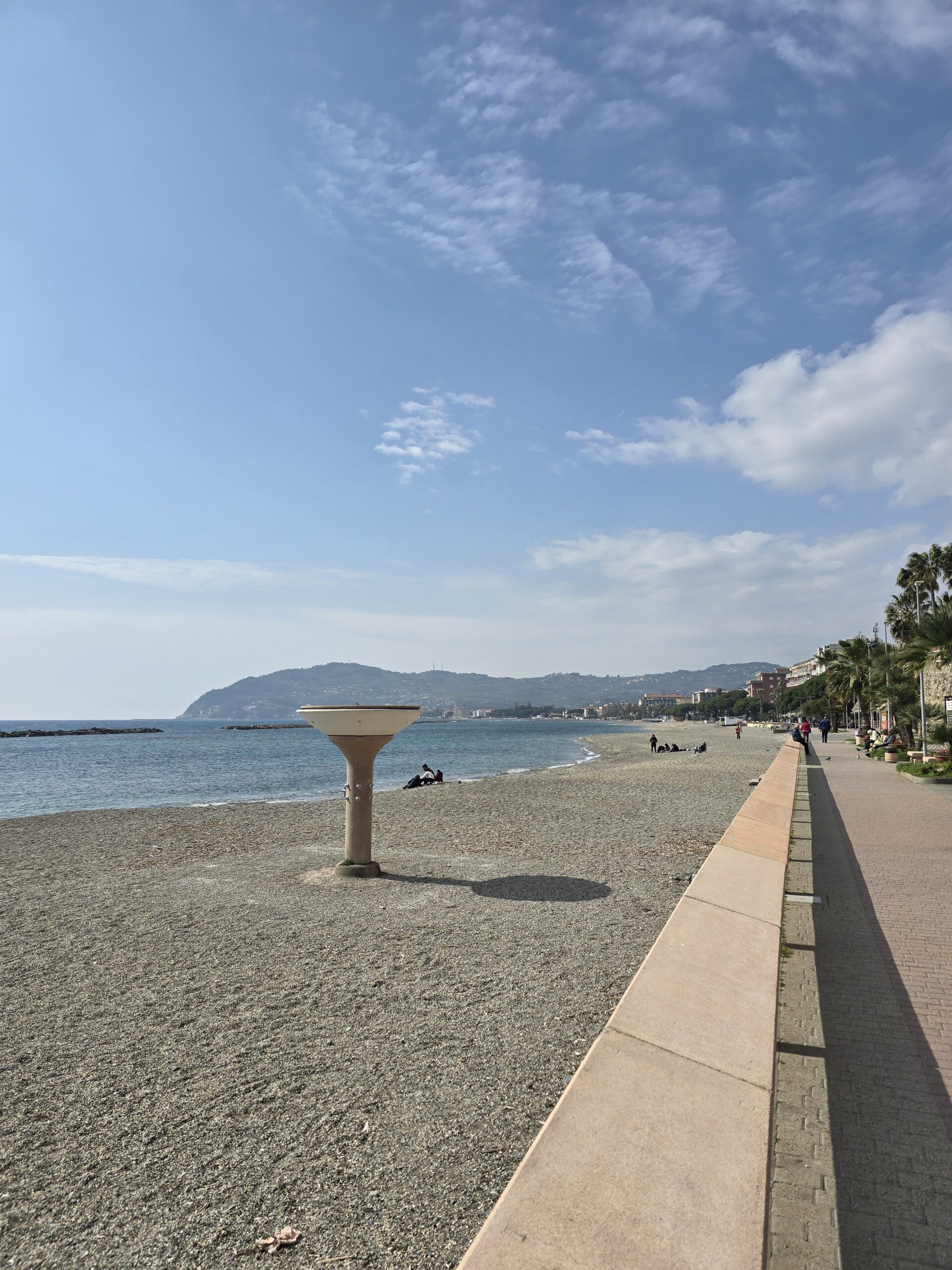 Nous quittons nos montagnes et prenons l’autoroute à Nice en direction de Gènes (Genova). Premier arrêt à San Bartolomeo al Mare. Nous trouvons l’aire qui se trouve Via Alessandro Manzoni. Une quinzaine de camping-cars sont installés, pour la plupart italiens, parcmètre à l’entrée, il en coûte 8€ par 24h avec l’eau et la vidange. Paiement uniquement en espèces (pièces) ou via une application. Heureusement, depuis nos débuts de camping-caristes, il y a 23 ans déjà, nous avons pris l’habitude de garder de la monnaie; auparavant, presque toutes les bornes fonctionnaient avec des pièces. Bon, cette aire ne fait pas vraiment rêver mais elle se trouve à deux pas du centre-ville et de la mer.