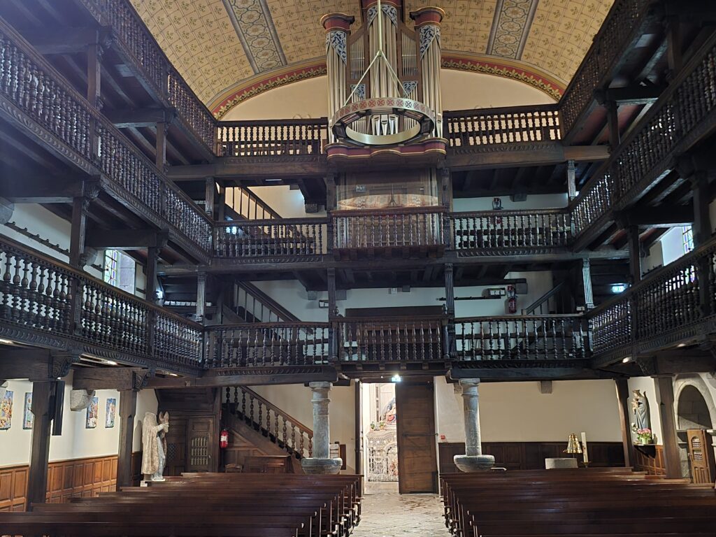 Visite de l’église Saint Laurent avec les typiques balcons en bois, appelés aussi tribunes intérieures qui tapissent les murs des églises basques entourant le choeur et l’autel.