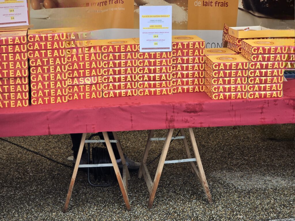 Comme prévu, la pluie se met à tomber. Direction le centre-ville sous le parapluie, c’est la fête du gâteau basque ce week-end. Pas d’indications en partant de l’aire, ce sera un peu récurrent dans la région. Beaucoup d’exposants mais la pluie n’a malheureusement eu aucun répit.
