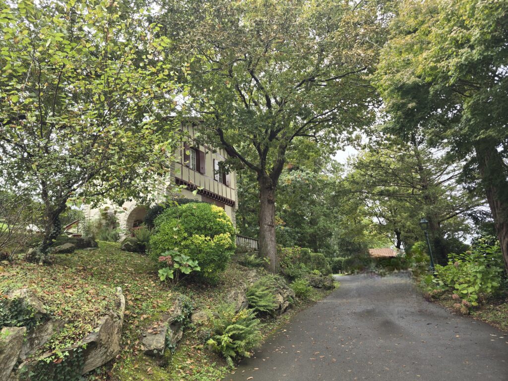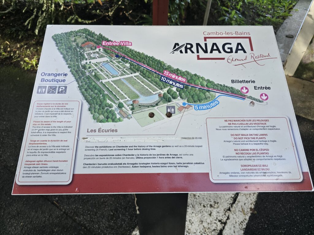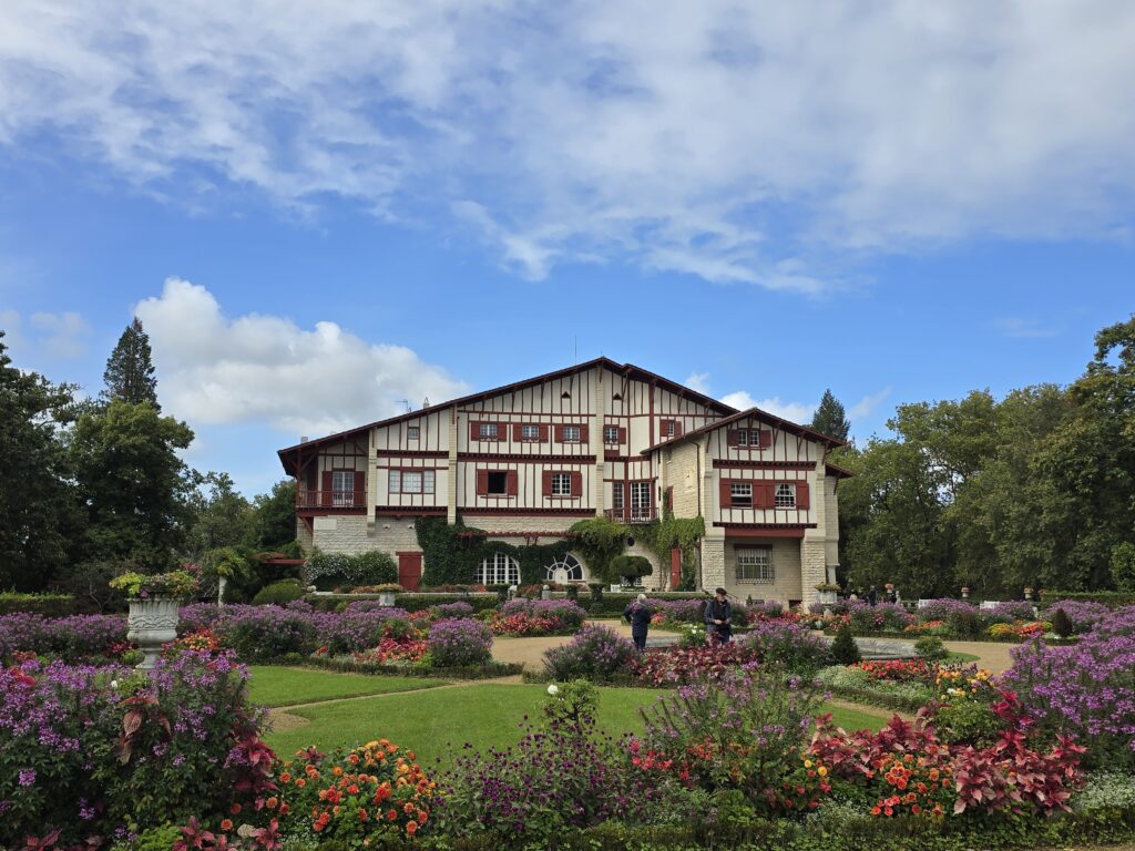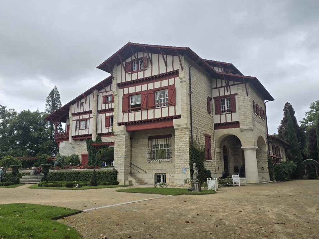 Le ciel semble un peu plus clément ce matin mais lorsque nous sommes prêts, la pluie se remet à tomber. Nous quittons l’aire et rallions le parking de la villa Arnaga, où vécut Edmond Rostand, l’auteur de Cyrano de Bergerac et son épouse, Rosemonde Gérard, poétesse et comédienne française. Il reste de la place, nous nous installons et déjeunons. La pluie se calme enfin et nous voilà partis, non sans oublier malgré tout le parapluie.
