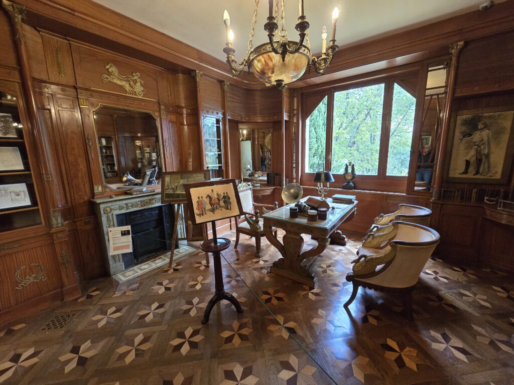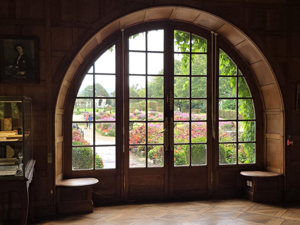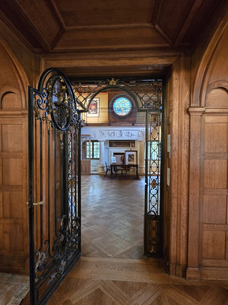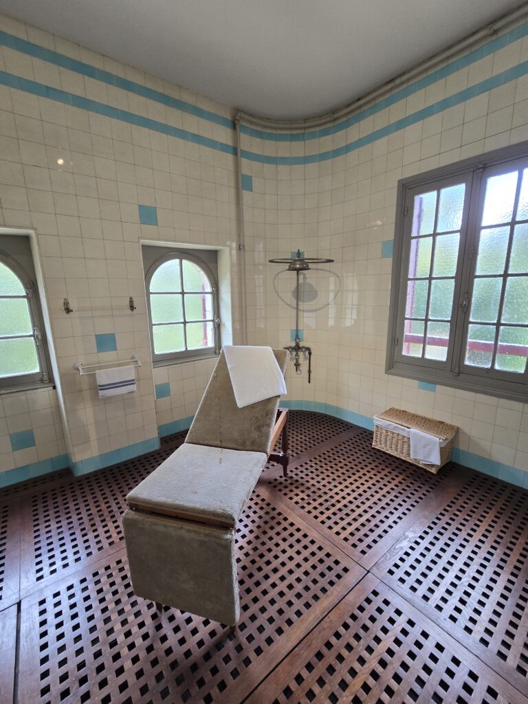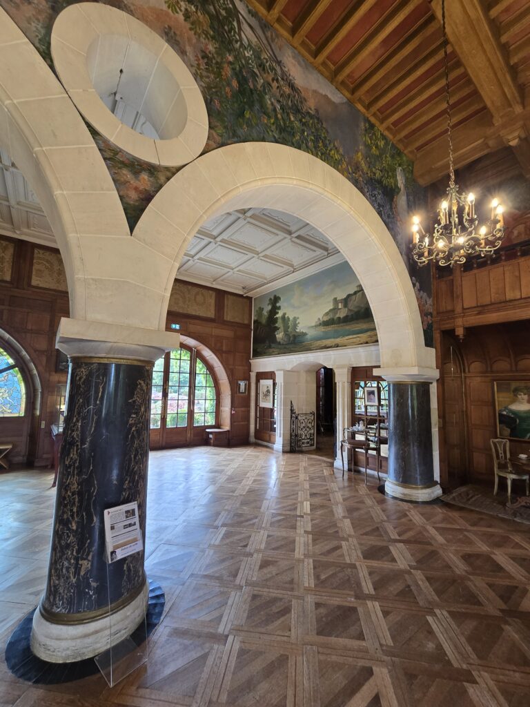 Il bruine encore un peu et nous patientons quelques minutes sous le porche d’entrée. Nous avons choisi la visite libre mais nous entrons en groupe à raison d’un par demi-heure environ. La villa est grande alors à un moment donné, l’accès d’une partie n’est plus visible mais la visite peut se prolonger encore dans une autre partie qui mène vers la sortie.