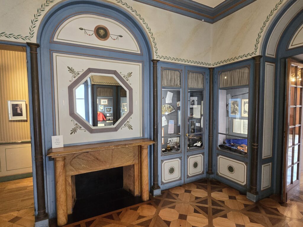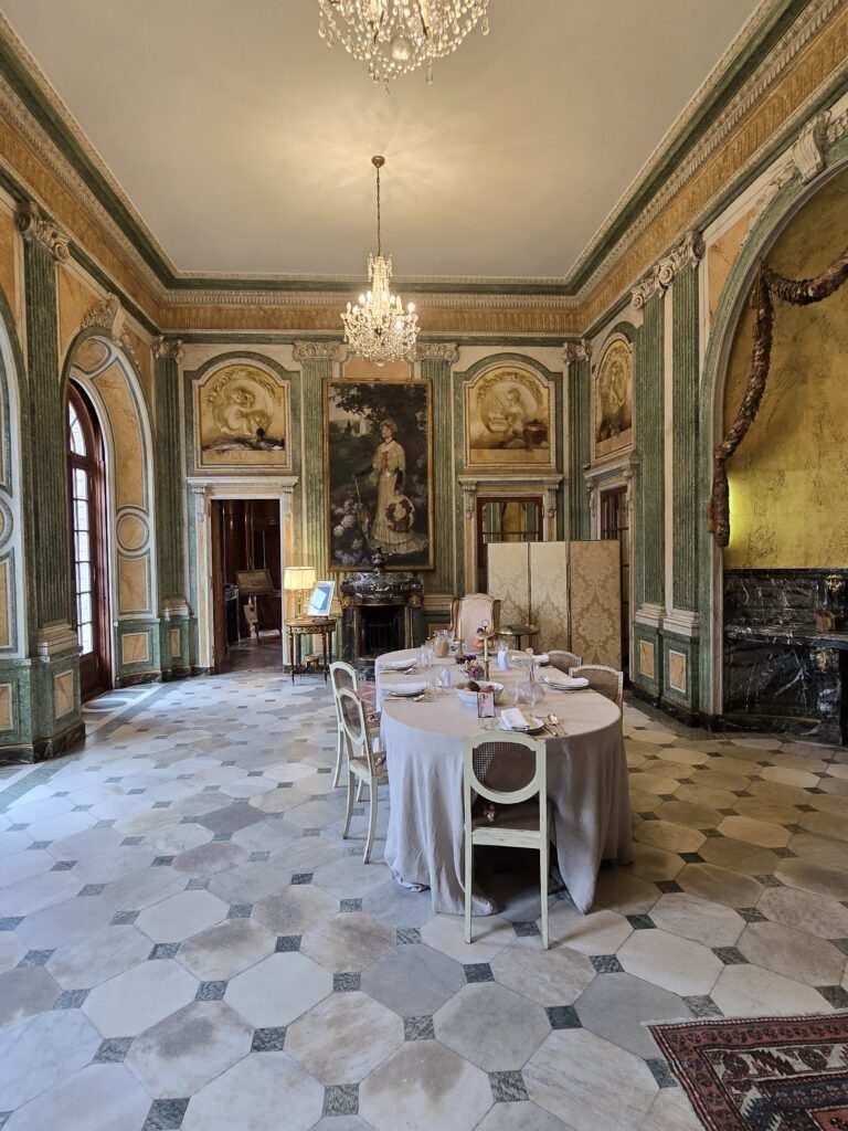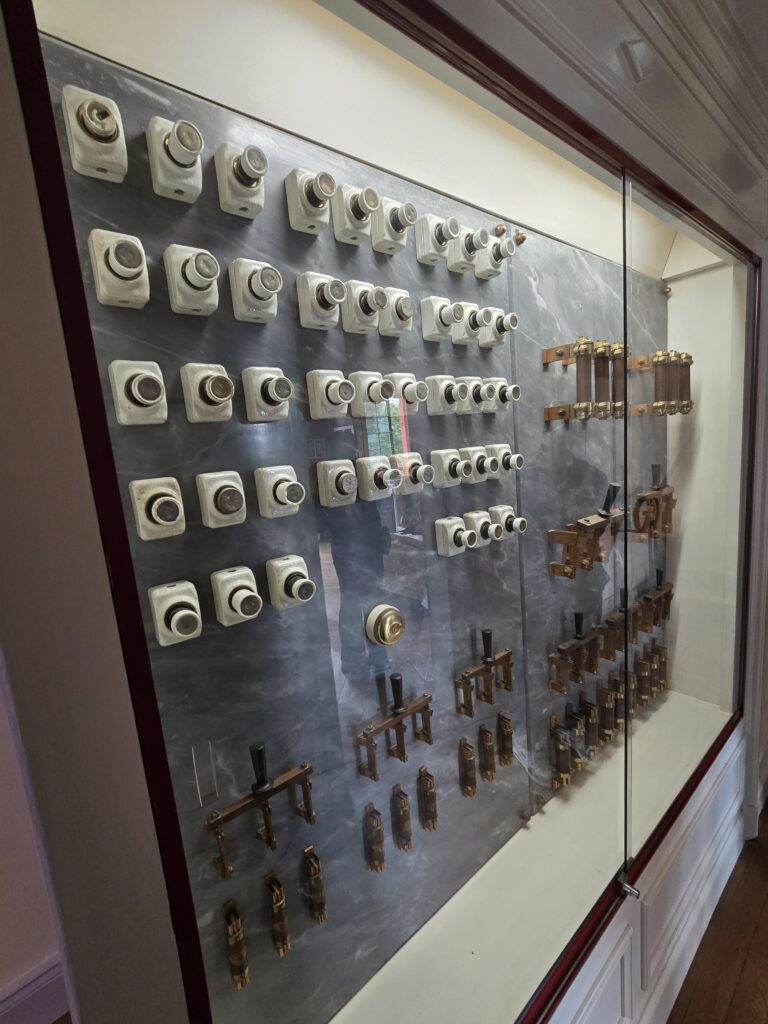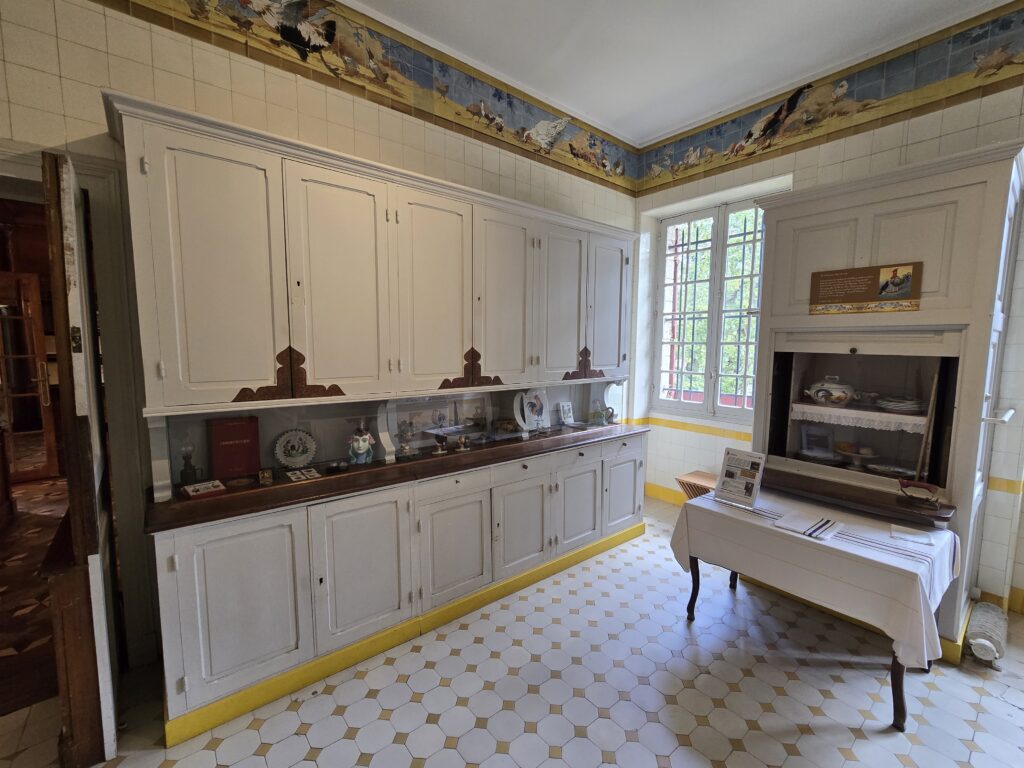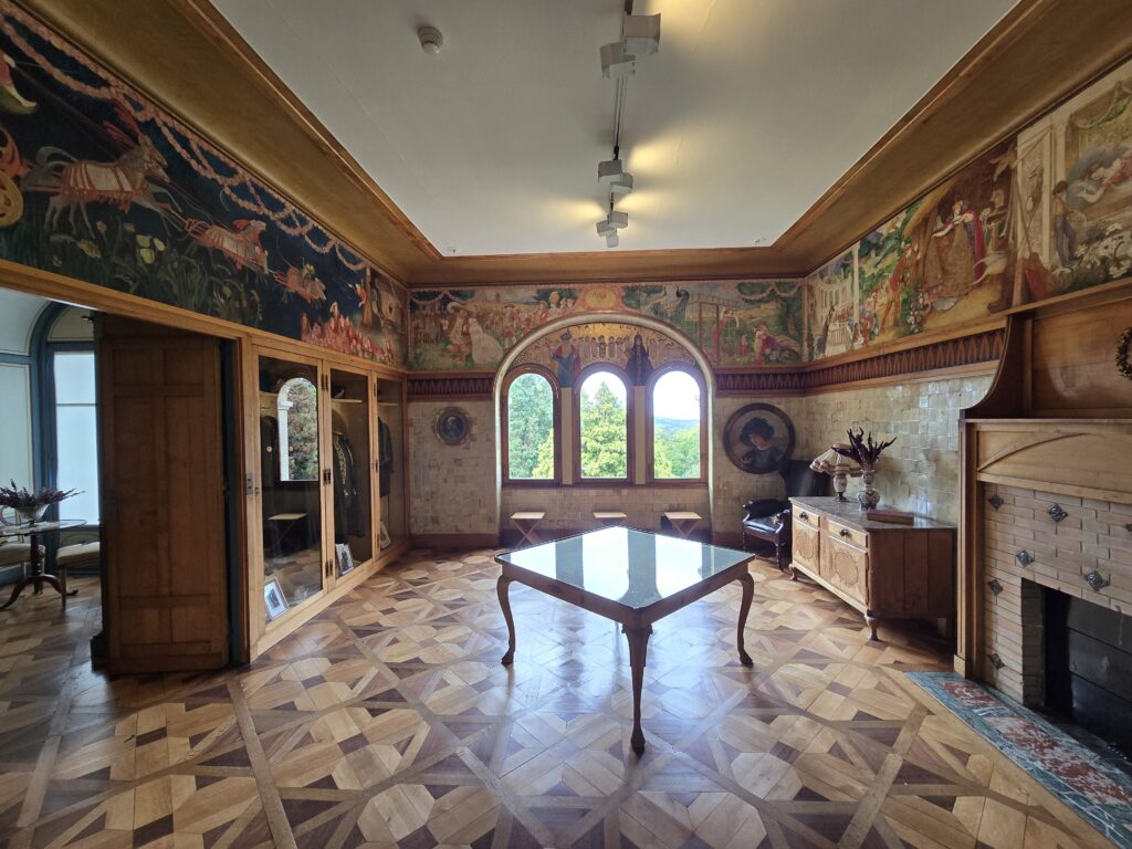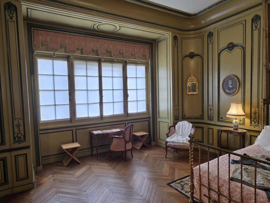 Il bruine encore un peu et nous patientons quelques minutes sous le porche d’entrée. Nous avons choisi la visite libre mais nous entrons en groupe à raison d’un par demi-heure environ. La villa est grande alors à un moment donné, l’accès d’une partie n’est plus visible mais la visite peut se prolonger encore dans une autre partie qui mène vers la sortie.