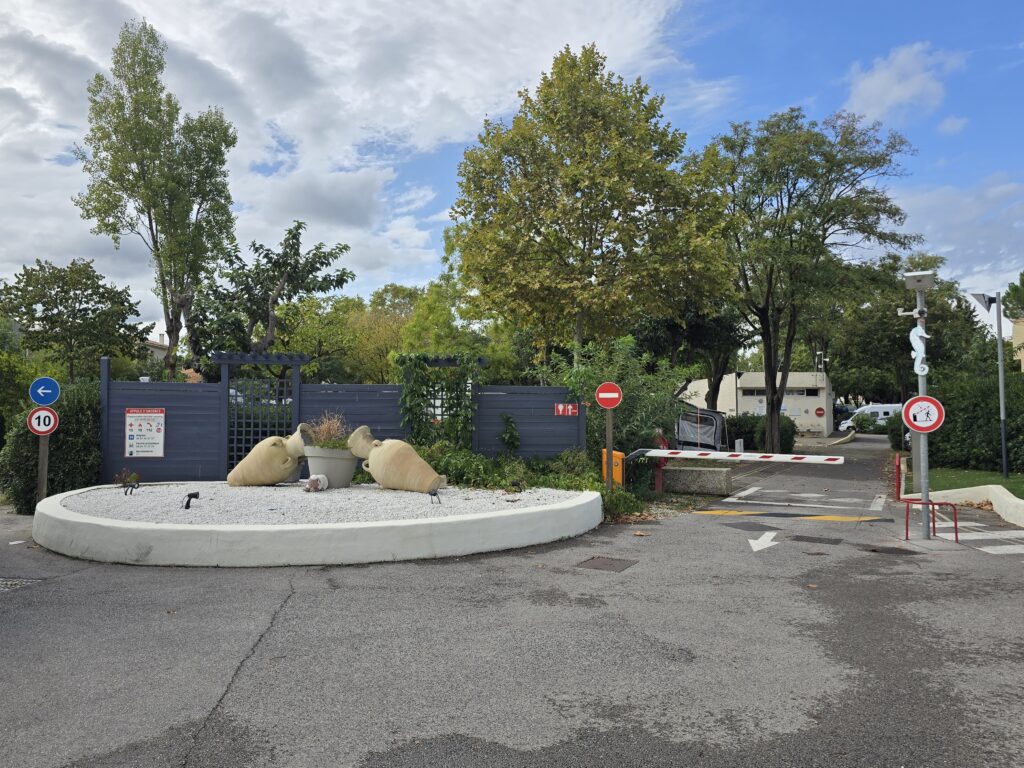 Cette aire « AirePark » est un ancien camping municipal, ombragée, proche du centre-ville à pied, 21€22 par jour, seulement quelques euros de moins que le camping situé face à l’étang. Elle offre de belles prestations, douches, bacs à linge et à vaisselle, barbecues. Un supermarché juste en face avec deux lave-linge automatiques et un sèche-linge.
