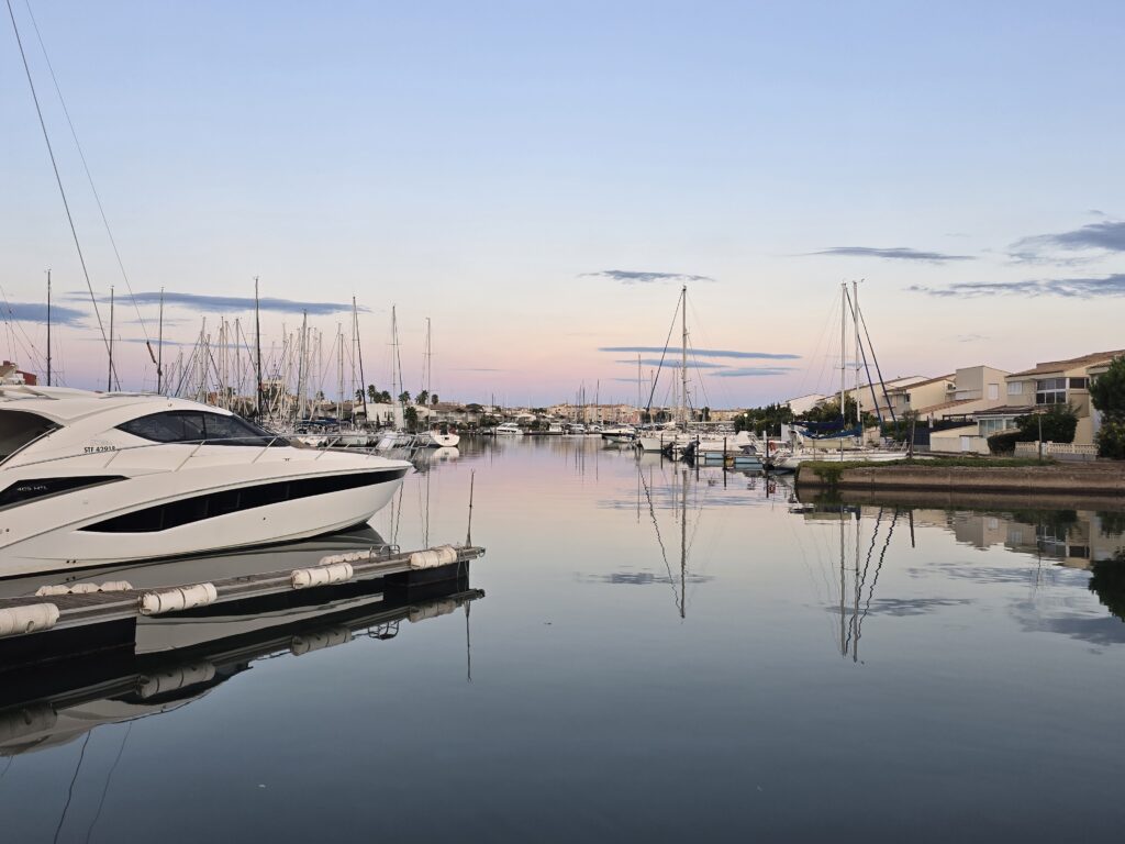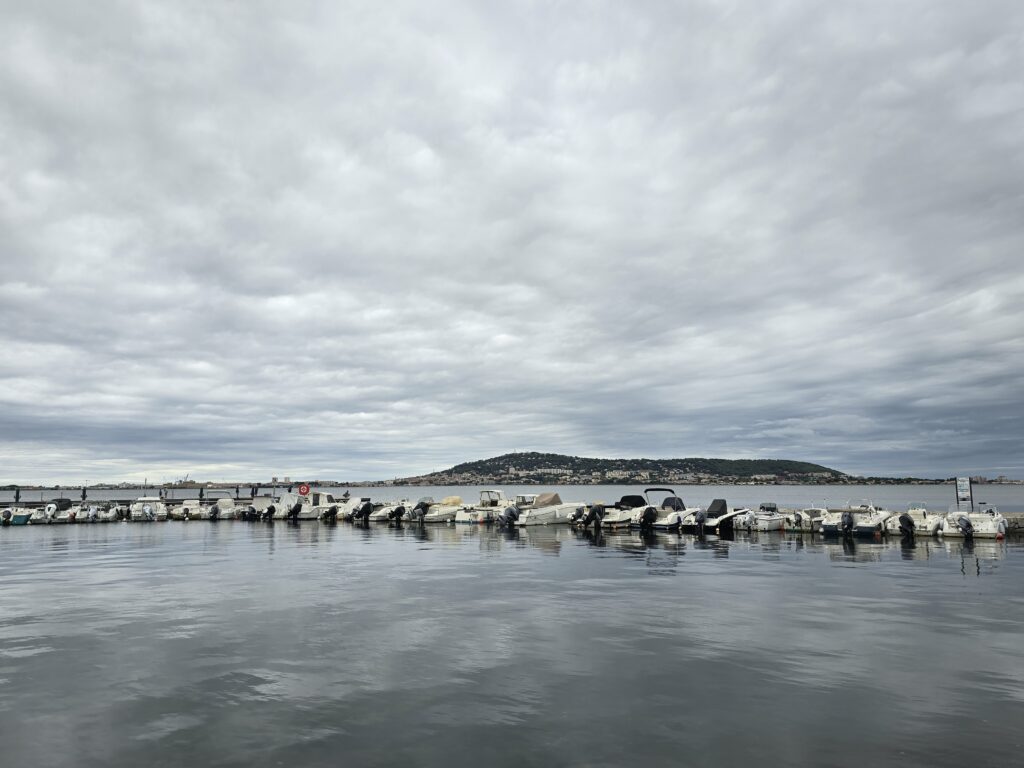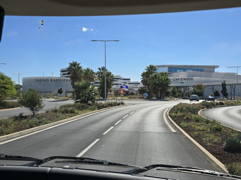Temps gris et lourd ce matin, quelques gouttes de pluie et du vent, ce changement de temps était prévu. Nous reprenons notre route en direction de Balaruc, comme prévu il y a deux ou trois jours.