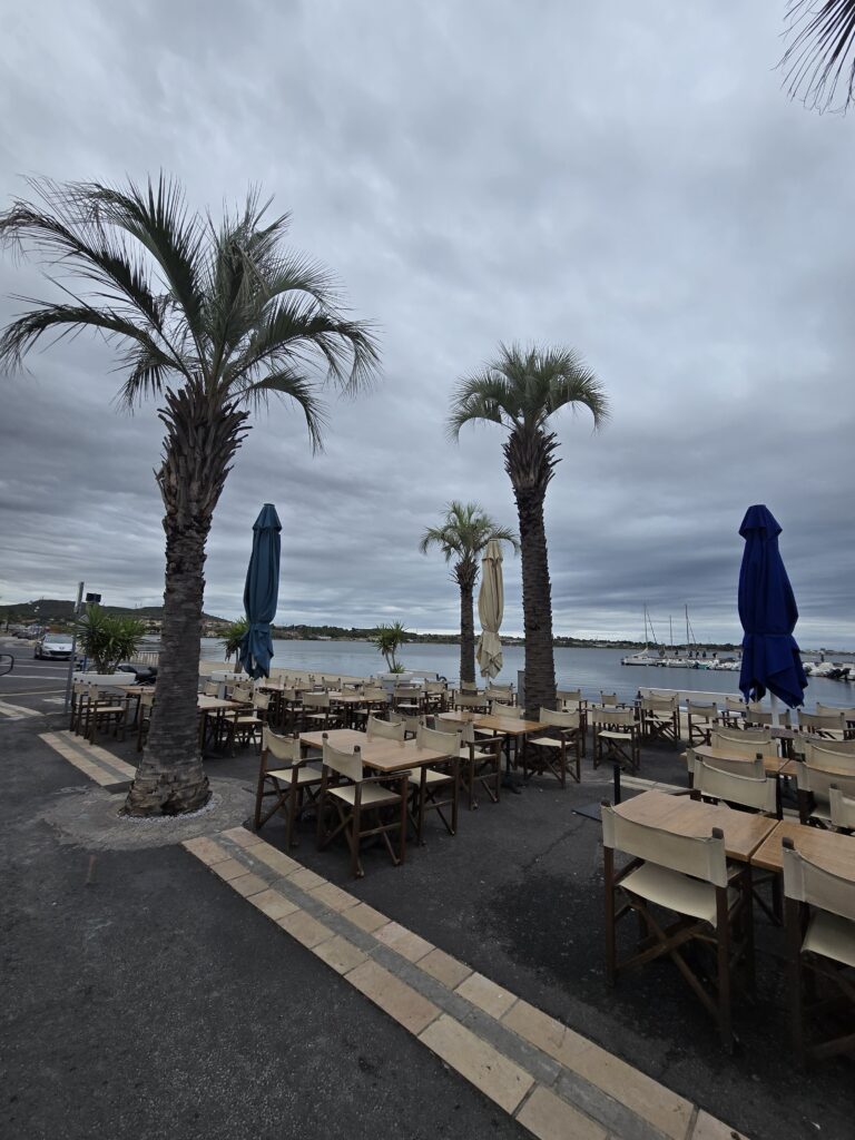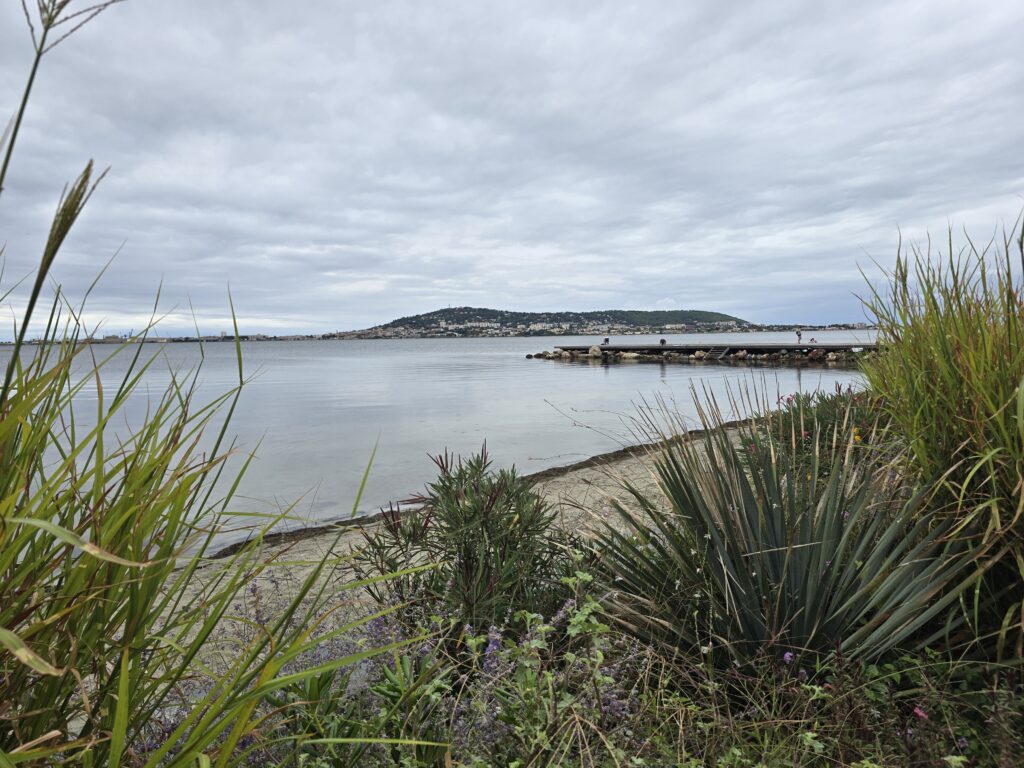 Nous lorgnons sur les menus de l’hôtel Martinez, pas celui de Cannes mais il a failli nous faire rester une journée de plus. Jolie place paysagée où les boulistes opèrent. Promenade sympathique le long de l’étang mais les marchands d’huitres manquent. Pas de parcs à huitres non plus en vue comme à Bouzigues situé non loin. Nous terminons la balade sous la pluie et à grande vitesse.