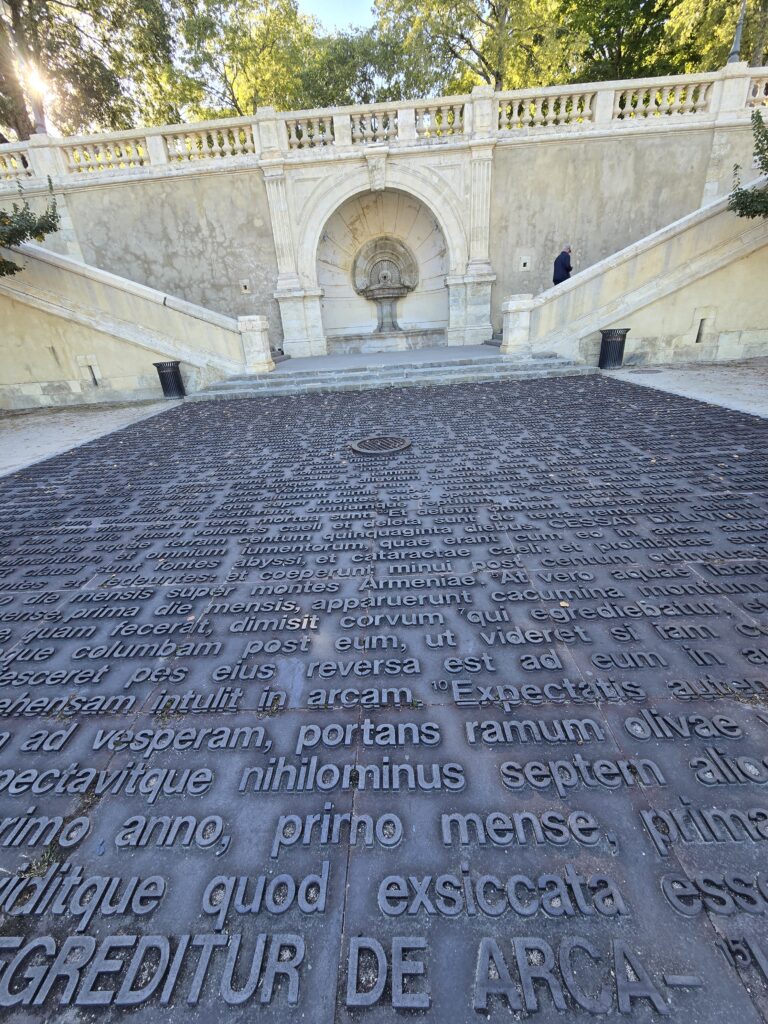 » Sur cette terrasse se trouve, depuis 1991, une sculpture en fonte réalisée par l’artiste catalan Jaume Plensa. Le texte latin gravé sur la plaque est extrait de la Bible (Genèse – Chap. 6 à 8). L’épisode du Déluge contenu dans la Genèse commémore ici les inondations qui ont meurtri la ville en 1977. Au centre de l’oeuvre, un cercle projetait à l’origine un faisceau de lumière destiné à éclairer le ciel et surveiller le temps. »