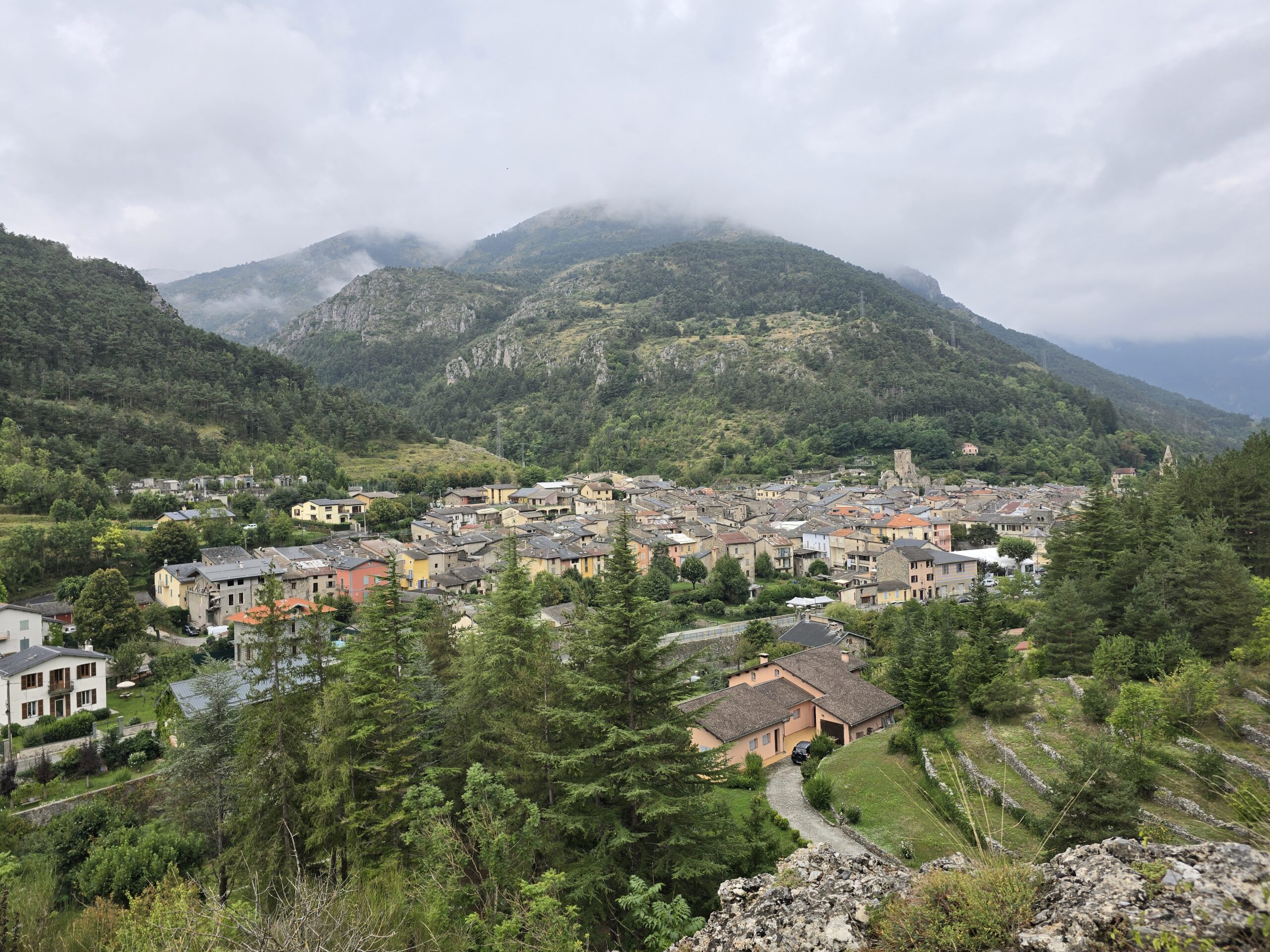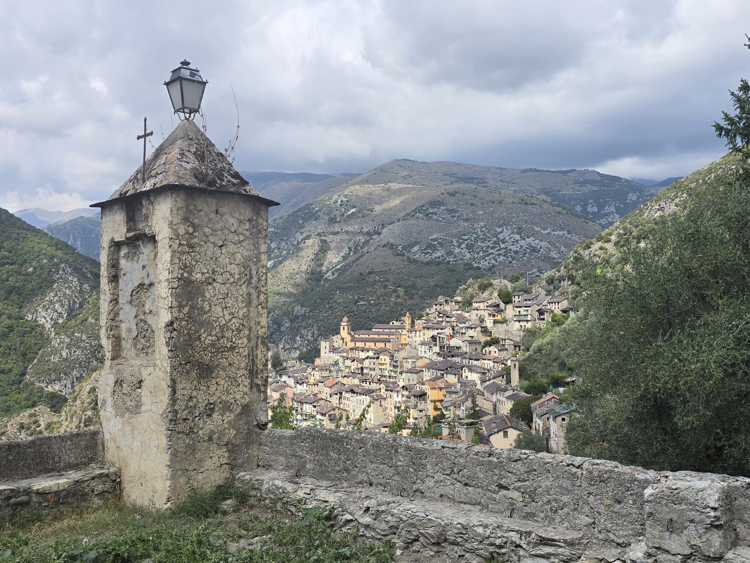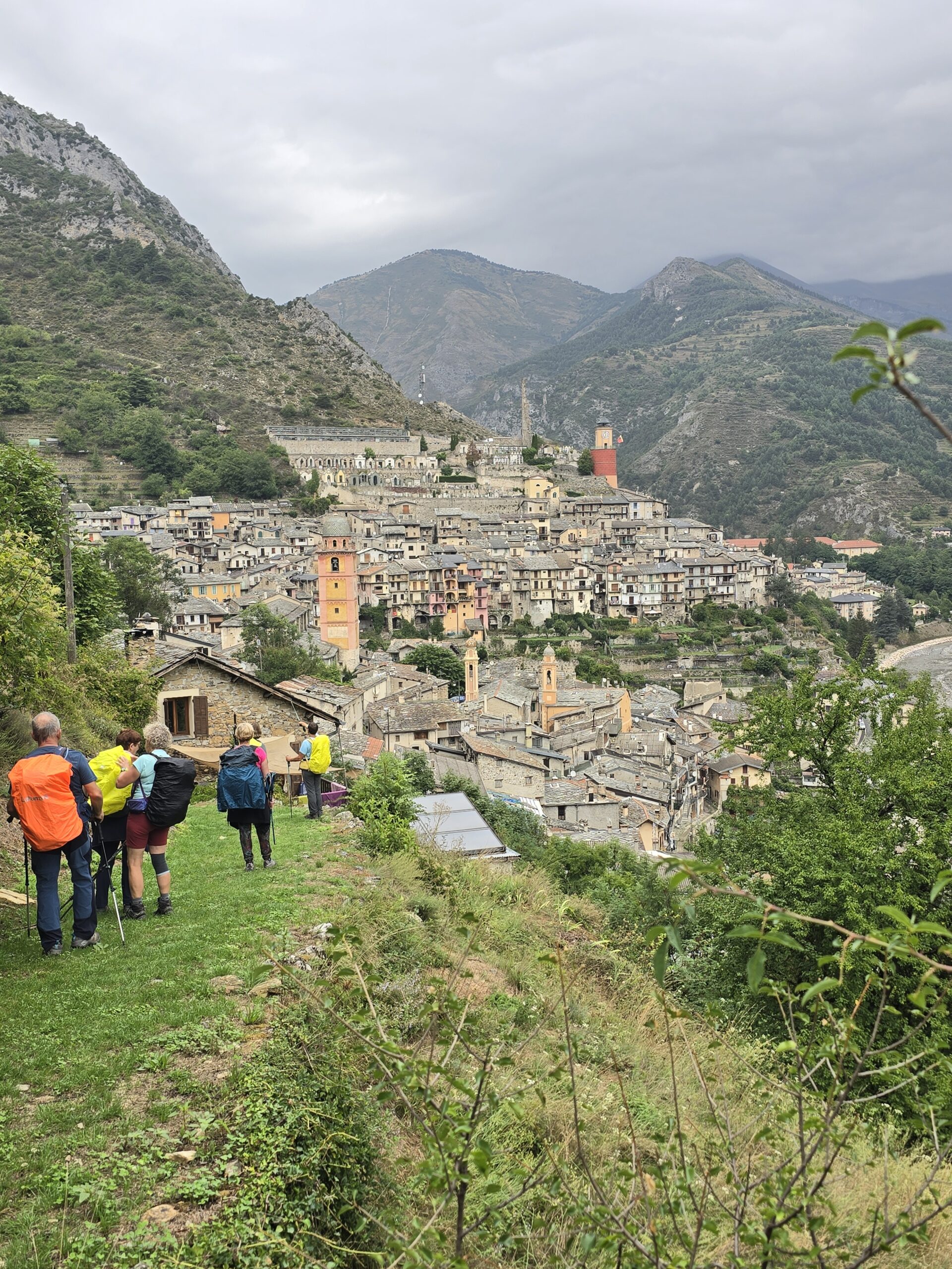 Il ne fait pas très beau aujourd’hui alors nous partons randonner dans les environs, avec en vue, un arrêt possible à l’abri pour le pique-nique à La Brigue, dans l’hôtel où loge notre guide (le notre était complet). La région est réputée aussi pour ses orages diluviens …