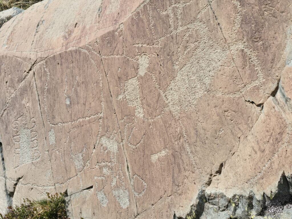 Nous arrivons sur un des sites règlementés des gravures rupestres. La visite est possible uniquement accompagnés d’un guide et les bâtons de marche doivent être protégés par des embouts en caoutchouc. Environ 50 000 signes ont été gravés sur des roches à la période du Néolithique. Ils sont mentionnés dans la littérature du 16ème siècle mais l’intérêt scientifique des chercheurs n’est survenu qu’à partir du 19ème siècle.