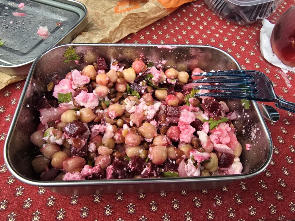 Notre guide arrivait chaque matin avec des gamelles individuelles garnies de délicieuses salades, le plus souvent  végétariennes et différentes chaque jour. Elles étaient agrémentées de fromages, pains spéciaux, fruits et tablettes de chocolat, différents chaque jour également. Chacun prenait sa gamelle, de l’eau bien sûr et une partie du reste du festin dans son sac à dos.