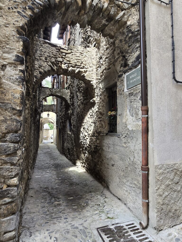 Après un pique-nique sans pluie et confortablement installés dans le salon de jardin en fer forgé de l’hôtel Mirval, nous visitons le village médiéval, rattaché à la France en septembre 1947.