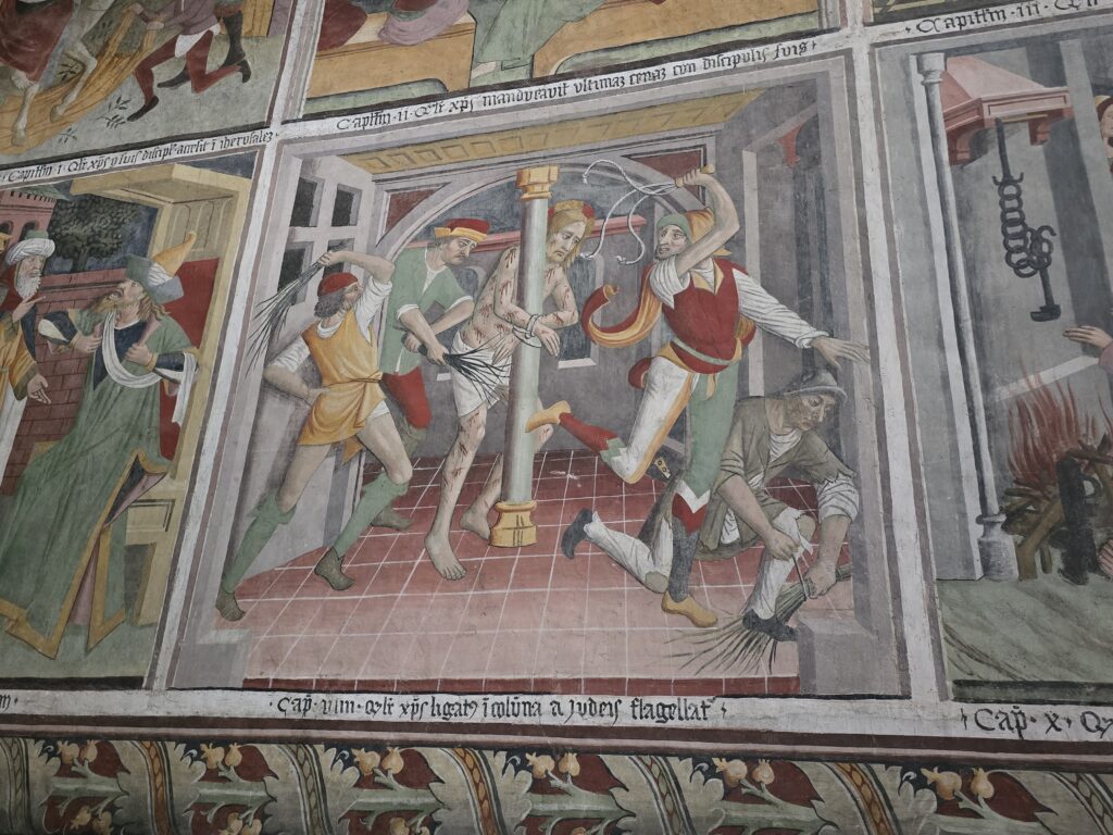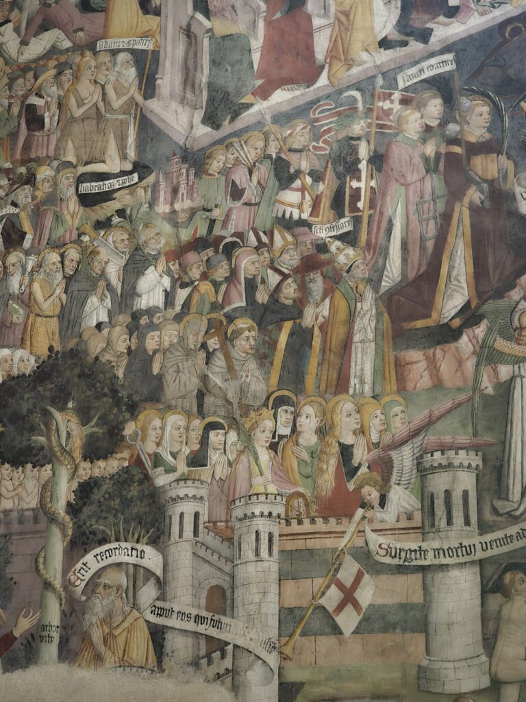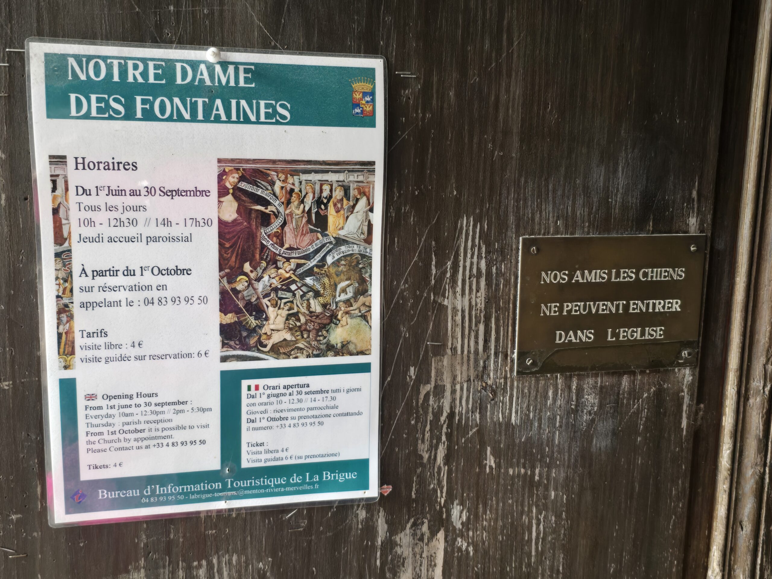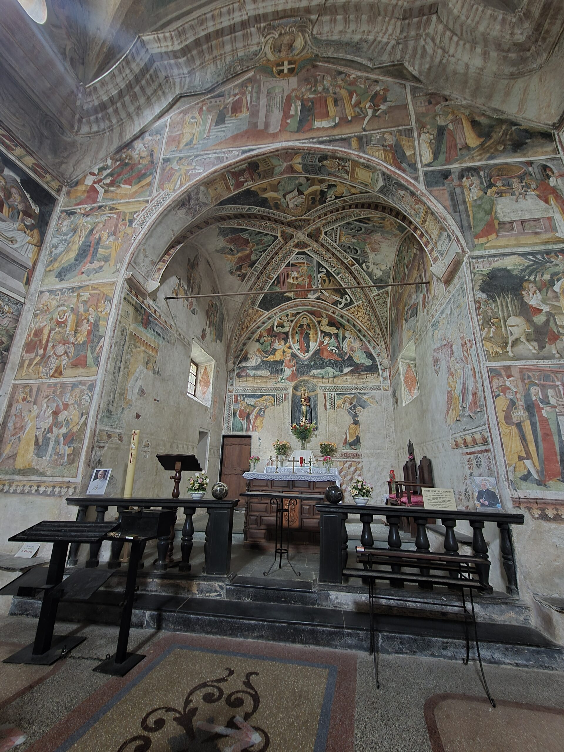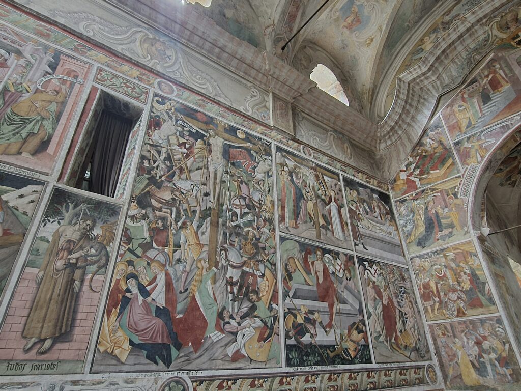 A l’intérieur, 220 m2 de fresques du 15ème siècle, réalisées par les artistes Carnavesio et Baleison, une bande dessinée illustrée du sol au plafond. Pas d’électricité donc pas d’èclairage.